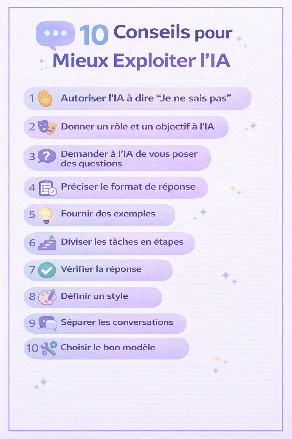 | 1 | Autoriser l'IA à dire qu'elle ne sait pas | Évite les inventions et les fausses informations |